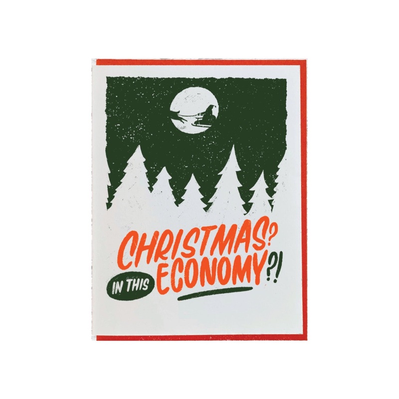 Part of our "In This Economy?!" line. One blank card, letterpress printed, with a coordinating envelope.Size A2: (4.25"x5.5")Hand printed on an antique letterpress in a cozy little studio.