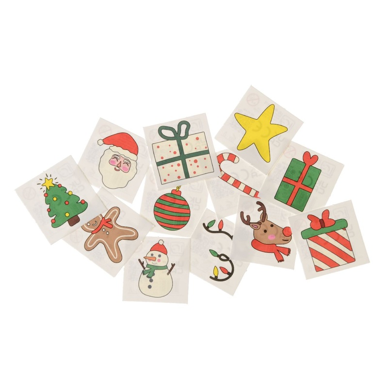 12x Christmas Temporary Tattoos: Get into the Christmas spirit with our set of 12 assorted temporary tattoos. Assorted Designs: Each bag contains a variety of festive and fun designs, including Santa, snowmen, presents, and more, ensuring there's something