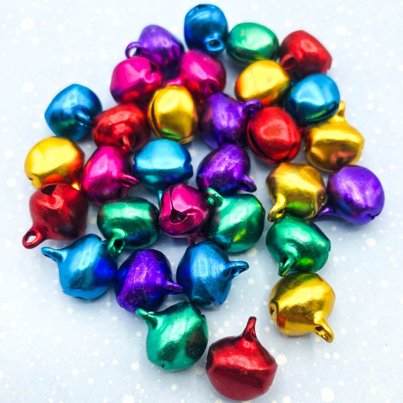 The jingle bells are metal and you will receive one sizeable bell in your colour choice. The bells have a satin metallic finish and measure 14mm tall including the hook. They are 12mm across.