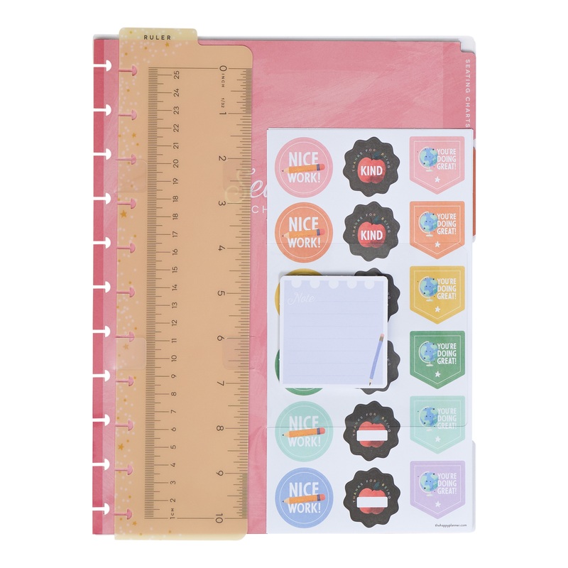 Designed with a teacher theme, this Seating Charts & Behavior Trackers Happy Planner Accessory Pack features warm tones and colorful borders. This pack of teacher desk accessories includes sticker sheets, dividers, a bookmark, filler paper, and sticky notepads. Add these useful teacher themed planner accessories into your Classic size Happy Planner or notebook to assist in your classroom organization.