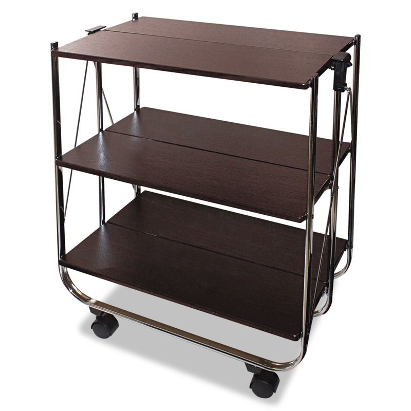 Chrome frame with sturdy MDF shelves in faux wood finish adds a touch of elegance to this service cart. Convenient folding design for easy storage when not in use. Folds open and closed with the touch of a button. Requires almost no assembly, just attach c