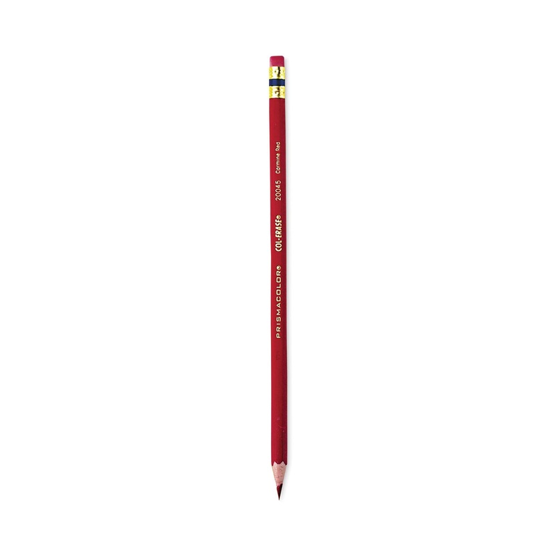 Prismacolor Col-Erase Pencils with Erasers feature vivid, easily-erasable pigments and a strong point that resists breakage. Ideal for print catalog artists and designers, these pencils are well-suited for illustrating, animating, and more. Retractable (Yes/No): No; Eraser (Yes/No): Yes; Graphite Color(s): Carmine Red; Color Family: Red.