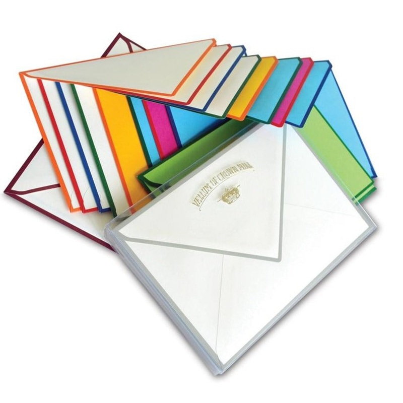 10, 4" x 6" flat, smooth finish cards and envelopes with a contrasting border on each and every edge. In a clear box. Made in Belgium.