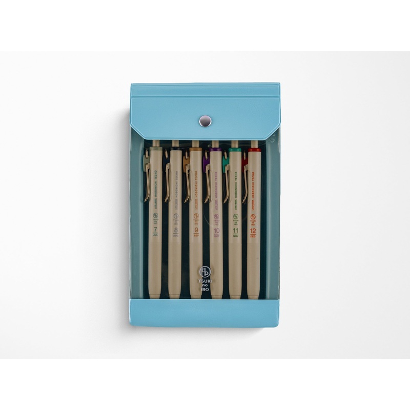 The Hobonichi Techo uses 12 soft colors across the book. The TSUKI no IRO stationery series incorporates these colors into simple designs.A set of six Uniball One pens selected to match the print colors used in the Hobonichi Techo. The JulyDecember set inc