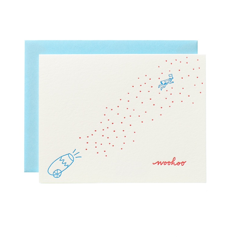 Hand drawn illustration turned into a letterpress print featuring a blast of woohoo and a high flying stunt man. Letterpress printed by hand on 100% cotton paper (no trees!). Hand-mixed inks. Card measures 4.25 x 5.5 inches when folded, blank on the inside