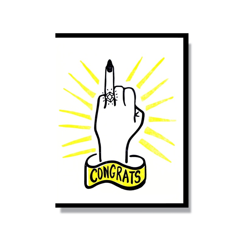 A2 (4.25" x 5.5").Letterpress printed by hand on luxuriously heavy FSC Certified stock.Blank inside.Includes sexy black envelope and cellophane sleeve.