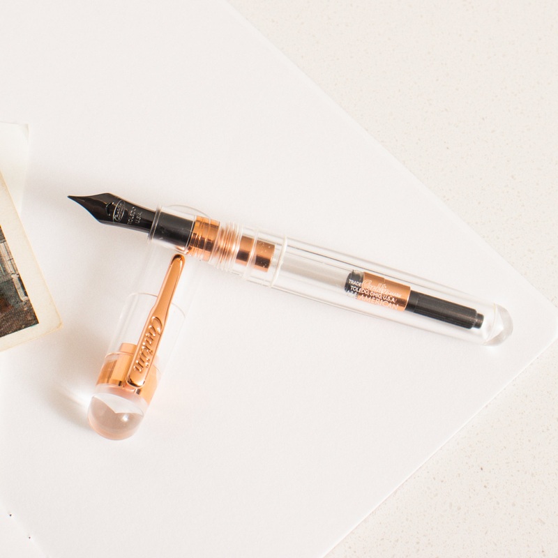 Made ofa clear resin with rose gold trim, this special edition Conklin All American is an oversized yet comfortable fountain pen.This fountain pen is offered with your choice of a reliable, smooth-writing black German made JoWo #6 steel nib in extra-fine, fine, medium, broad, or 1.1mm stub, or the new JoWo Omniflex flexible steel nibfor variation in line width. With six nib options, you are sure to find a selection to fit your handwriting style.