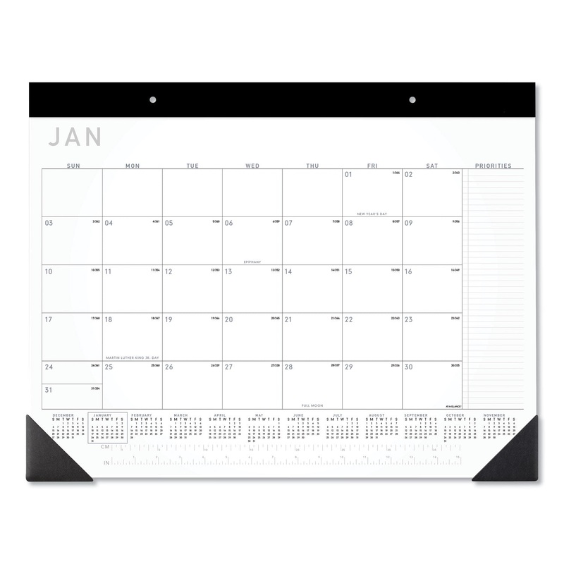 Contemporary desk pad features a fashion-forward color scheme and design elements. Monthly protection for your desktop with a full 12 months of planning. One month per page with unruled daily blocks to write in notes and reminders on each date. Extra writing space for priorities also included. Full year calendar reference on each monthly calendar page makes it easy to quickly look up dates. Desk pad pages are white with black top binding. Dated/Undated: Dated; Calendar Format: Monthly; Page Format: One Month per Page; Edition Year: 2024.