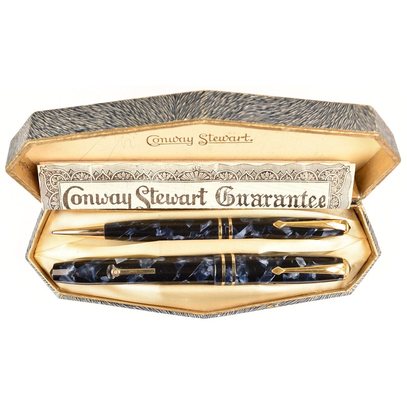 Boxed 24 fountain pen and matching 18 pencil set in blue pearl and black marble with gold-filled trim - pencil takes 1.18mm leads and the pen is fitted with a medium 14k nib - c1951 - the set comes with its original Conway box and guarantee/instruction lea