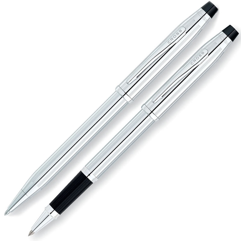 The perfect mix of tradition and progression has brought us the Cross Century II collection, a new take on the iconic Cross Pen which features a broader profile and makes a bold statement. This Cross Rollerball and Ballpoint pen set has been crafted to the highest standard and finished in a high sheen chrome with delicate lined details. The look is finished off by a contrasting black grip section on the rollerball which matches the tip of the pen cap. An engraved Cross pen can make a wonderful gift and these Cross Century II Pens are ideal for adding your own personal touch.
