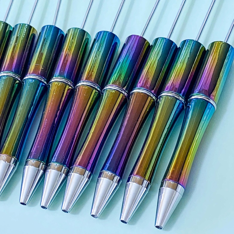 Build you own pen! Each deep rainbow metallic pen base writes in black ballpoint ink. The base twists round to activate the pen. Add to these pen bases with silicone or other jumbo beads.