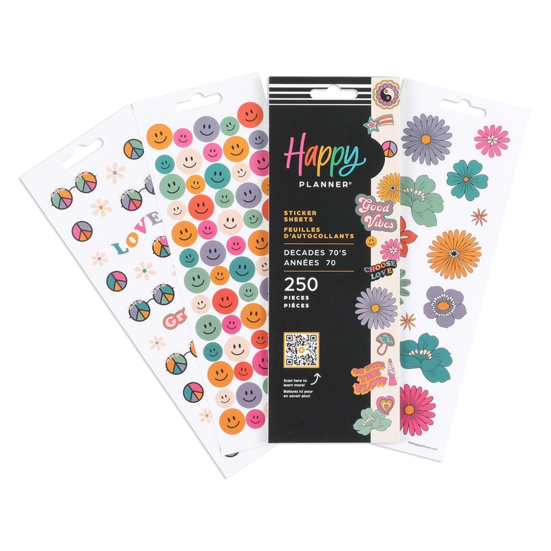 Go with the flow. Keep yourself organized and feeling good with this 8 sheet sticker pack. Use these groovy and far out stickers on any planner spread or in your favorite notebook!8 1970s-themed sticker sheets with 250 stickersFlower power floral stickers