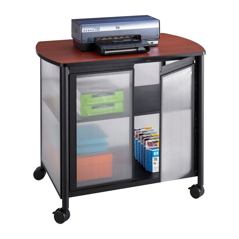 DetailsAttractive machine stand with double doors, featuring steel frame and translucent polycarbonate panels, adds a touch of class to your office area. Generously sized Cherry laminate top accommodates most office machines. Storage with one fixed interio