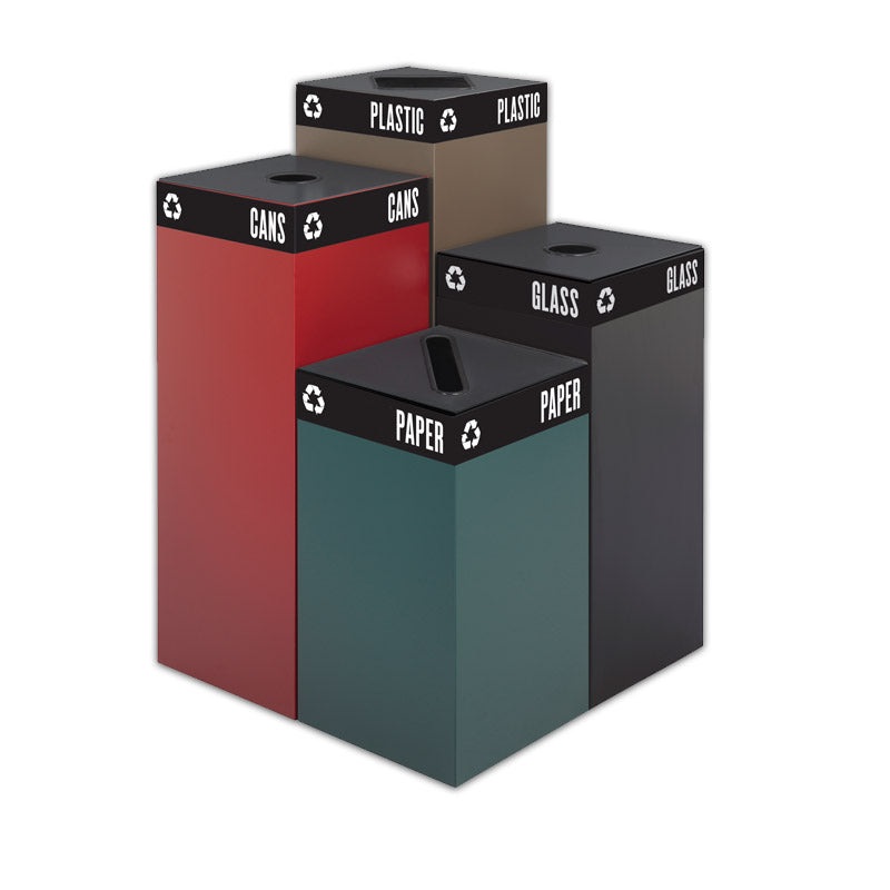 Our Deluxe Square Recyclers are available in 25-, 31-, 37-, and 42-gallon capacities, and 3 top choices: Slot for paper, Hole for cans and bottles, and Square for Plastic and Waste. Bases are constructed from heavy-gauge, powder-coated steel, and hinged lids open to reveal wire bag holders. Each size uses standard trash bags (not included). Each unit has a 15 1/4″ x 15 1/4″ footprint, and looks equally impressive clustered in a group, or aligned along a wall.