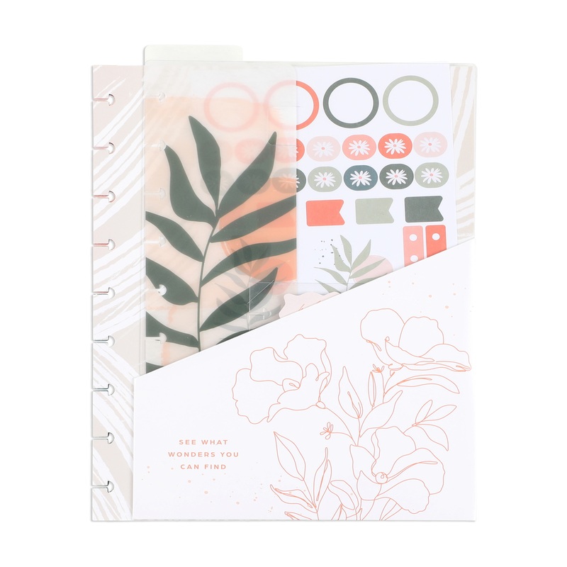 Designed in a desert theme, this classic accessory pack features warm colors and botanical accents. It includes a pocket folder, filler paper, a bookmark, sticker sheet, and sticky notes. Add these into your Classic size Happy Planner, notebook, or journal to bring more utility to everyday planning.