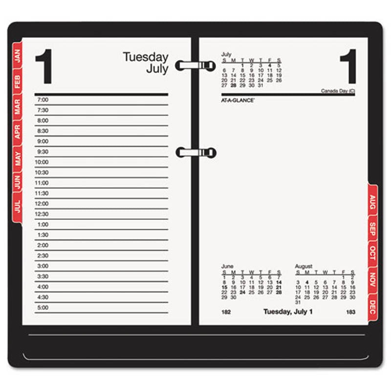One day per two-page spread ruled for appointments; Saturday/Sunday combined. Monthly tabs for easy referencing of dates; lined for projects, to-do’s and reminders. Tab set is printed in red; easy snap-in feature; can be used with all 17-style refills.