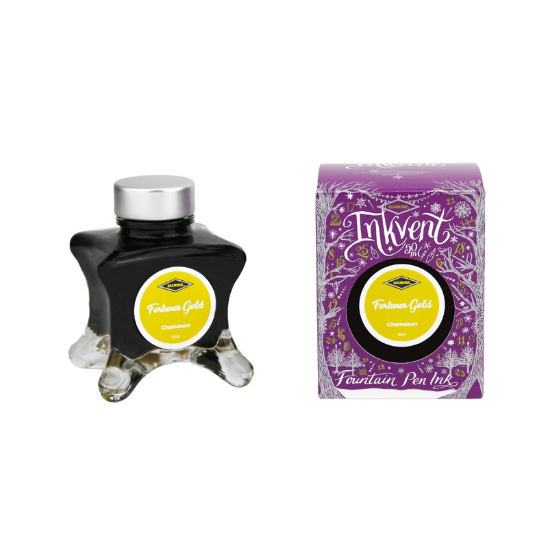 Diamine Fortunes Gold is a yellow shimmering fountain pen ink, from Diamine’s 2023 Purple Edition Advent Calendar, which featured 25 brand new colours. Fortunes Gold is a vibrant yet rich golden ink, accompanied by a subtle green shimmer, which also shades to darker tones with a wider nib. It comes beautifully presented in a uniquely shaped 50ml glass bottle.