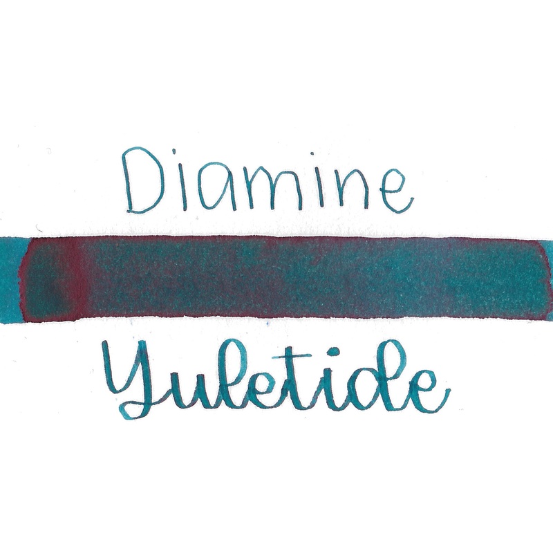 Diamine Yuletide from the Red Collection (Inkvent 2021) is a medium blue-green with medium shading. It dries in 20 seconds in a medium nib on Rhodia and has an average flow. Diamine ink is made in the UK.BrandDiamineInk NameYuletideCountry of OriginUKColor