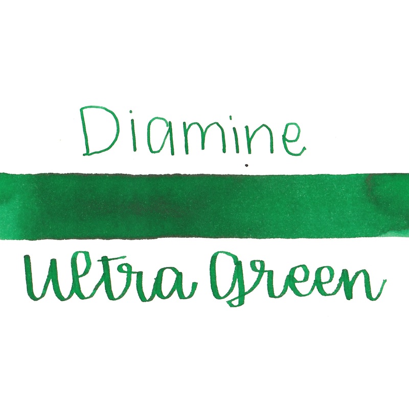 Diamine Ultra Green is a dark green with medium shading. It dries in 10 seconds in a medium nib on Rhodia and has an average flow.Diamine ink has been made in England since 1864.BrandDiamineInk NameUltra GreenCountryof OriginEnglandColorGreenDry Time10 Sec