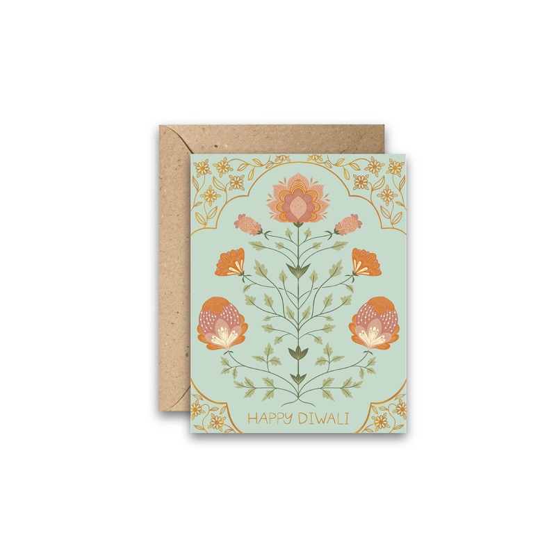 This beautiful Diwali card features intricate flowers highlighted with a gold window foil frame and is the perfect way to celebrate the holiday of lightsSize: 4.25" x 5.5",A2Blank insideProfessionally Printed on 100# FSC-Certified PaperGold foil detailsKra