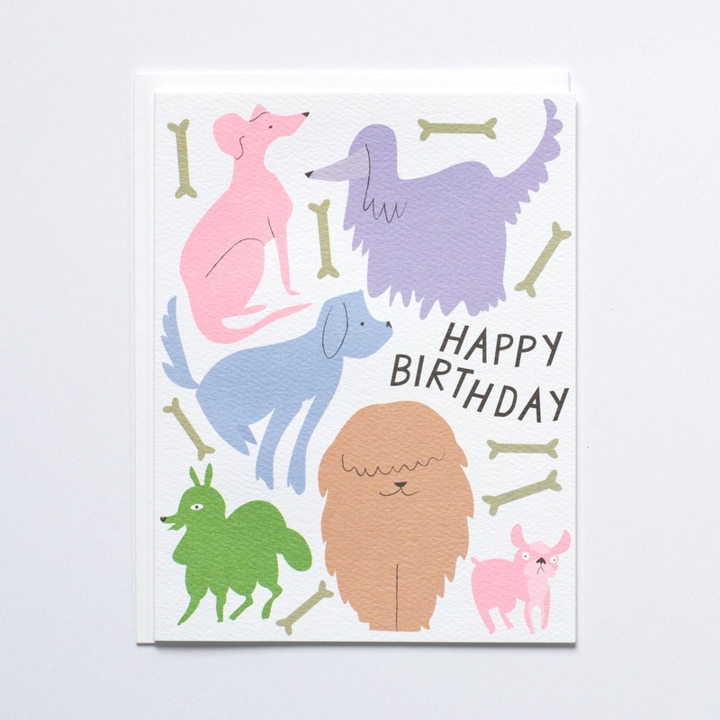 A pack of dogs wrap this card front and back, with a myriad of canine breeds and personalities.Whether you love afghans, sheepdogs, tiny French bulldogs, or a classic rescue, there is a dog here to chime in with the happiest of birthday wishes! Size:4.25 x