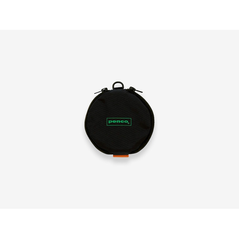 Penco's Double Door Purse Black is a small round purse with two zippers, and hence two pockets. This way you can separate small coins from cards, or other small items. In addition, your can use an optional cord strap to sling it accross or attach it to you