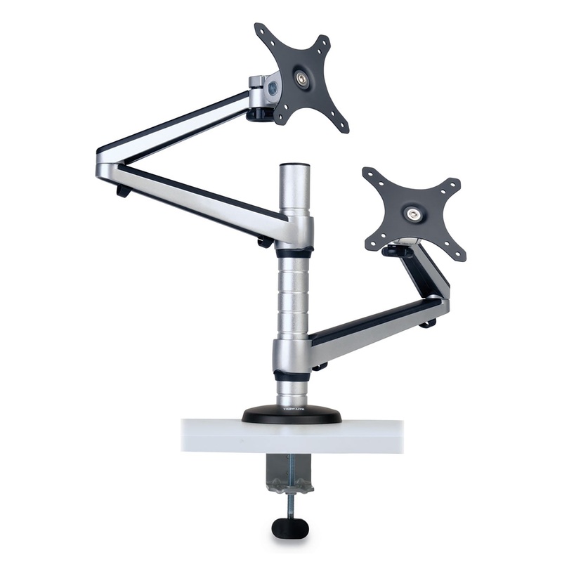 The dual full-motion flex arm desk clamp attaches to your desk, table or workstation, allowing you to mount two monitors above it and free up valuable work space. Ideal for home and office, the product fits most flat-panel displays from 13" to 27". Dual sw