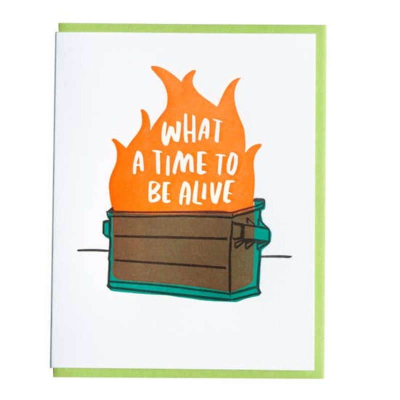 What a dumpster fire of a time to be alive. Folded card measures A2 (4.25 x 5.5) and comes with an envelope. Letterpress printed on 100% cotton paper.