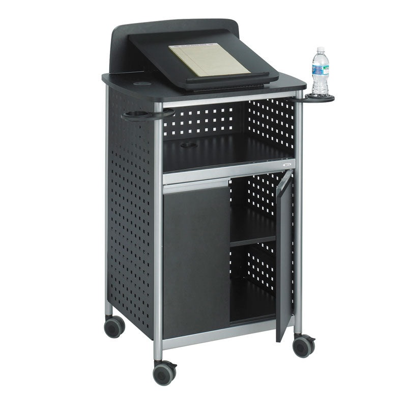 DetailsThe DuraScoot Multi-Purpose Lectern has a unique hole pattern design and silver leg accents. Black powder coat steel construction with a black laminate shelves. Mobile on four casters (2 locking). Two swivel cup holders and a platform that folds dow