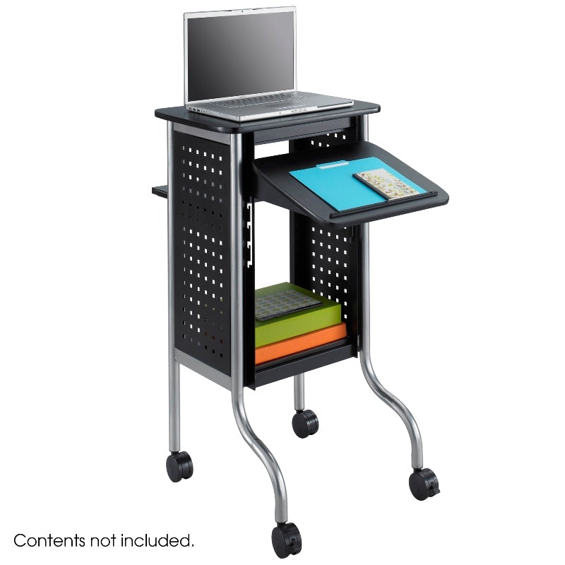 Hop, skip and DuraScoot your way to success!The contemporary DuraScoot Presentation Cart provides three platforms for the perfect presentation combination. The stylish multi-platform cart has the ability to hold a laptop, LCD screen and projector to support both current and future technological advancements. Features a height adjustable shelf at a convenient 15 degree tilt. And the bonus bottom shelf gives the added luxury of storage on the go! DuraScoot comes with four swivel casters, two locking, so you can mobilize your station when you need it most, and zoom from room to room with ease.