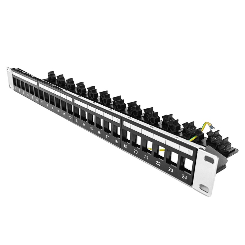 DYNAMIX 24 Port 19” 1RU STP / UTP Unloaded Keystone Patch Panel with Rear Cable Management bar. Grounding Wire Included.RoHs Numbered 1-24.with plastic labelling Kit