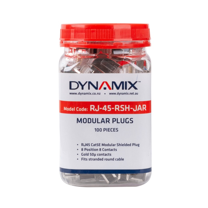 DYNAMIX Cat5E Modular Shielded Plugs in 100pc Jar. For Stranded Round Cable, 8P8C Internal Ground Shielded, Modular Gold 50u Micron Contacts. STOCK CLEARANCE SALE Up to 50% OFF
