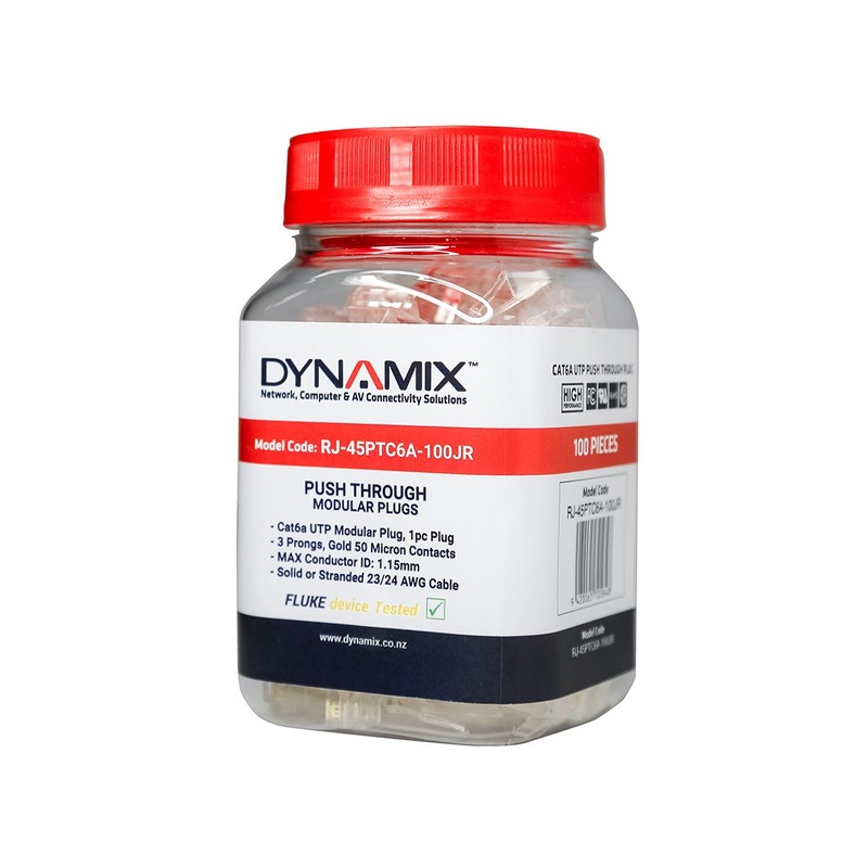 DYNAMIX Cat6/6A UTP Push Through Plug. 3 Prong 50 u" 100pc Pack. For Solid & Stranded Cable. Max Conductor Size: 1.15mm.Our DYNAMIX RJ45 Pass-through modular plug connectors are designed to simplify the process of terminating RJ45 modular plugs, by allowin