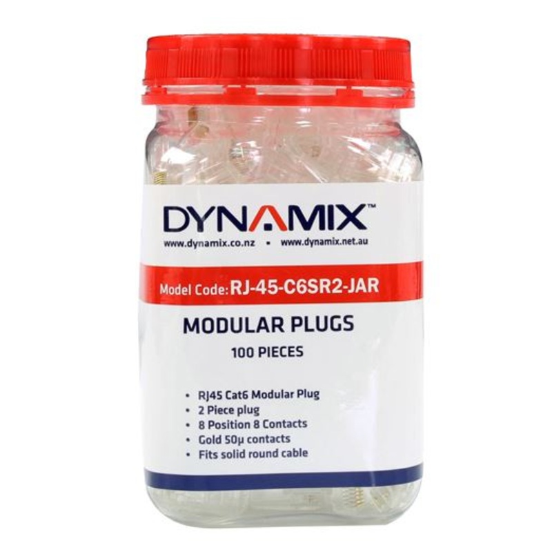 DYNAMIX Cat6 RJ45 Plug 100pc Jar, 8P8C 2 Piece Modular Plug (Rounded Solid). 50 micron