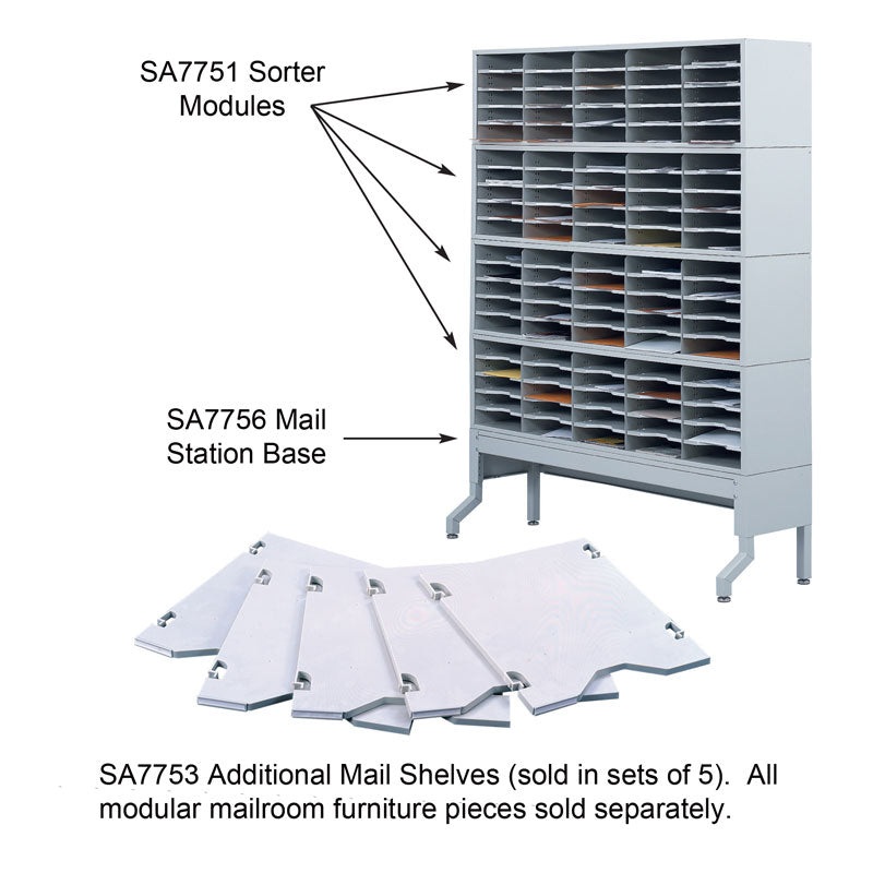 FeaturesFive additional black shelves for E-Z Sort Mailroom FurnitureHeavy-gauge steelBlack powder coat finish for durabilityDetailsMake work life E-Zier! Additional mail trays available in cartons of 5. For use with the Sorter Module Model 7751GR.Dimensio