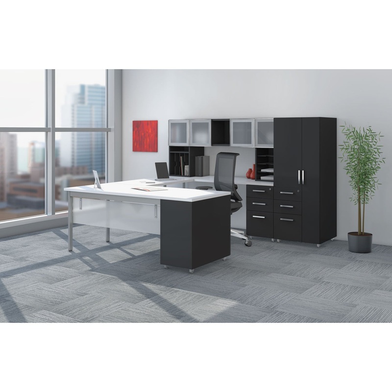 Hard-working workstation includes 72 x 30 desk with acrylic modesty panel, 42" bridge with acrylic modesty panel, 72 x 24 credenza, two box/box/file pedestals, 72" overhead cabinet with frosted glass doors, vertical organizer and horizontal organizer. Ther