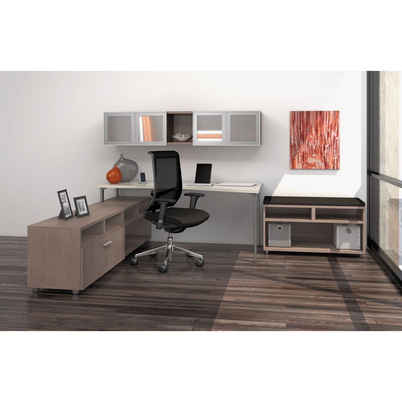 Space-efficient workstation includes 72 x 30 desk, 36 x 18 file storage cabinet and 36 x 18 open storage cabinet. Thermally-fused laminate worksurface with matching casegoods. File drawer operates on full-extension ball bearing slides and accommodates lett