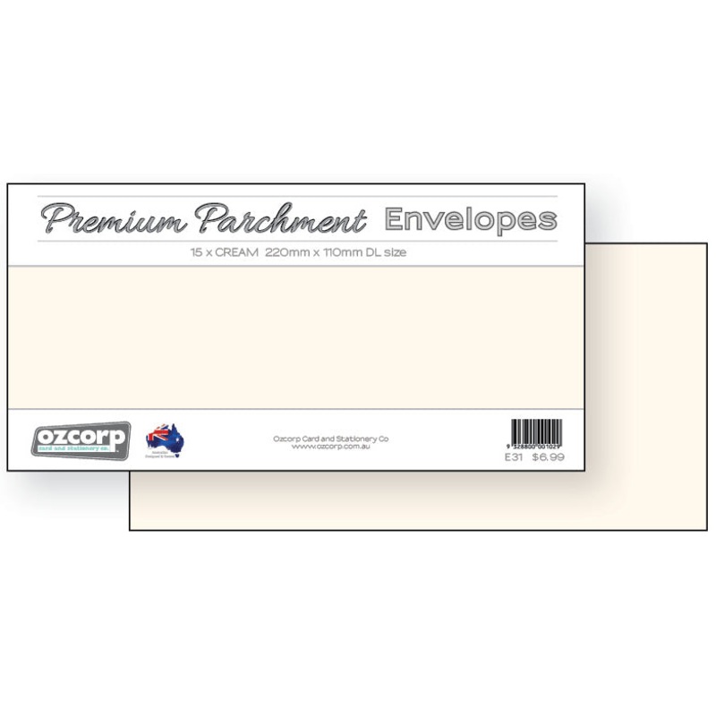 W5W8S8W7ENVELOPE OZCORP DL 22X11CM PREMIUM PARCHMENT CREAM PK15 G42903