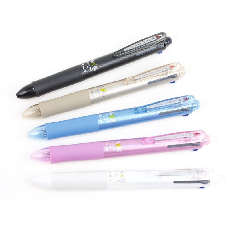 The erasable pen from Pilot that actually erases is now available in a multi-pen! This pen is perfect for people who need to erase their pen marks, but want to have multiple colors at hand. The Frixion multi is bright and cheerful. The body of the pen is a unique mix of translucent and opaque material. It has a shiny metallic futuristic barrel with a rocket-cone shaped eraser tip. We know crafters love to use it for fabric – pen marks disappear under the heat of an iron! We like to use this pen for taking notes on printed documents. We often annotate books, charts, or calendars and love to use this pen when we might need to change our notes.