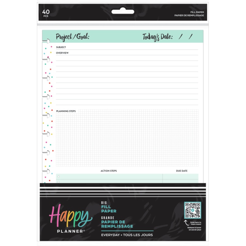Expand the life of your planner with filler paper! Add these Everyday Happy Planner Big filler paper pages to your Big size planner, journal, or notebook. Extend its utility while you boost your productivity with planner accessories that extend your planner’s use. These double-sided pages have dotted lines. Write notes, journal, and keep your to-do lists going!