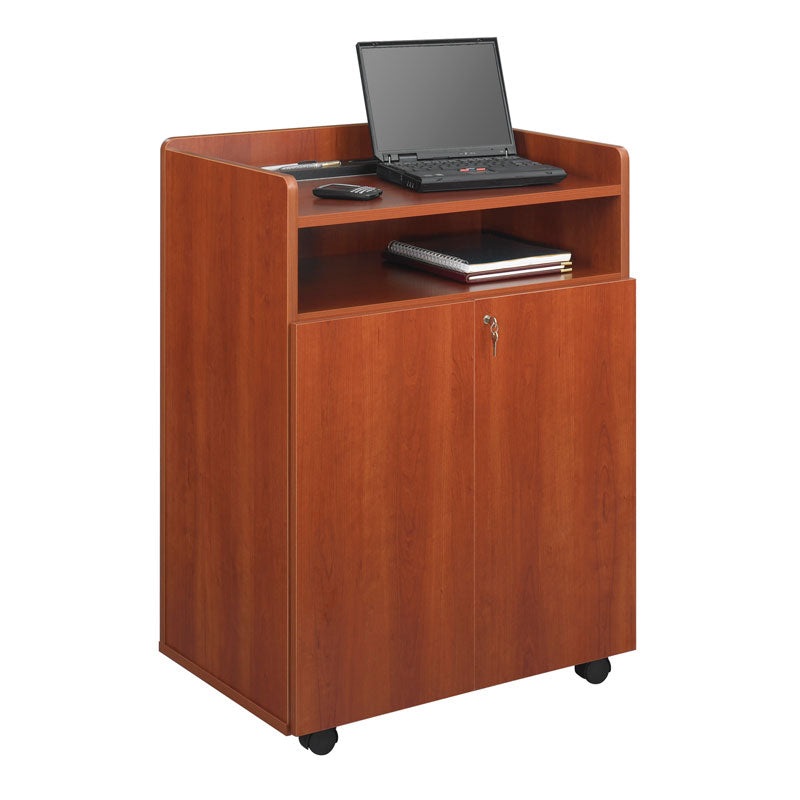 Present like an executive! The multi-functional mobile presentation stand doubles as a beverage cart. The large 28″W x 18-5/8″D presentation surface features a pencil tray and a 2-5/8″H containment lip with an open compartment below. Locking cabinet features double doors with a height adjustable interior shelf to store presentation materials or food service items. Mobile on four swivel casters (2 locking). Quality 3/4″ furniture grade wood construction. Easy assembly with cam-lock fasteners.