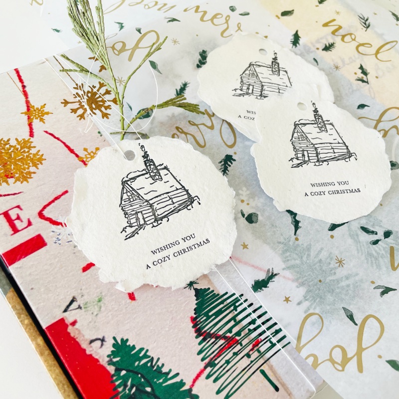 Soft whitehandmade paper circles with full deckled rounds. Black letterpress printed illustration with a snowy cabin above the words "wishing you a cozy christmas". Finished with botanically-dyed silk ribbon loops in emerald. Available as singles or setsof