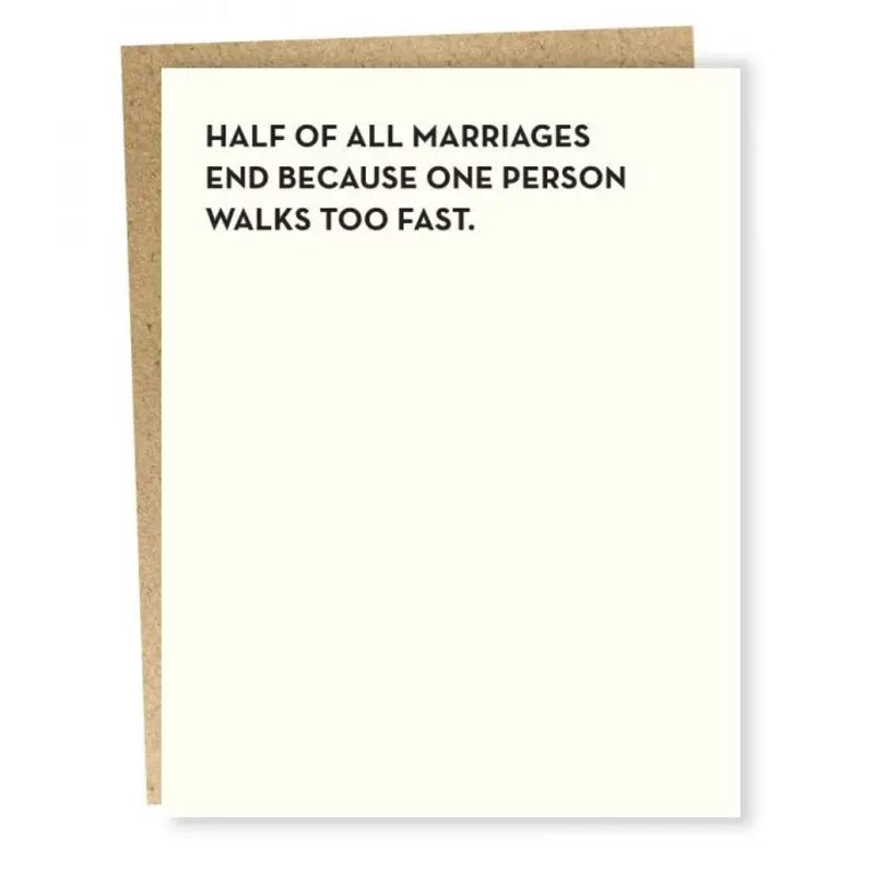 Half of all marriages end because one person walks too fast.Size: 5.5 x 4.25 "Inside Message: blank Paper: ecru cottonEnvelope: brown bagPrinting: letterpress Ink: black