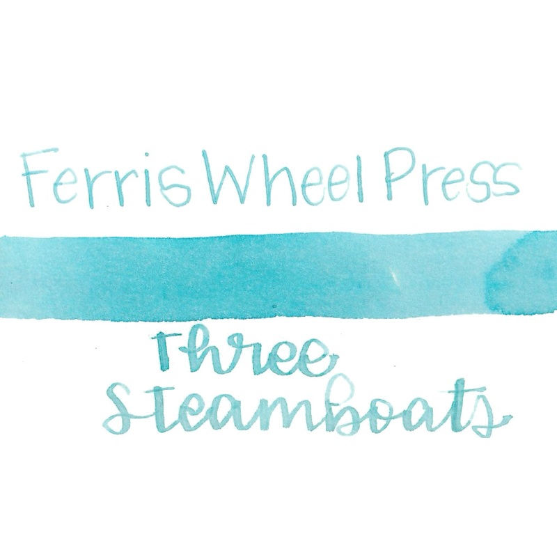 Ferris Wheel Press Three Steamboatsfrom theSummer 2020 collectionis alight sky bluefountain pen ink withmediumshading. It dries in30seconds in a medium nib on Rhodia paper and has a slightly dry flow.