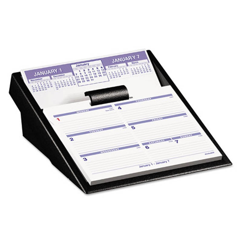 FeaturesWeekly pages flip up and drop into convenient storage base.One week per page, ruled for open scheduling.Current, two past and two future months reference; Federal holidays highlighted.Printed in blue and red inks.High-impact, black molded plastic b