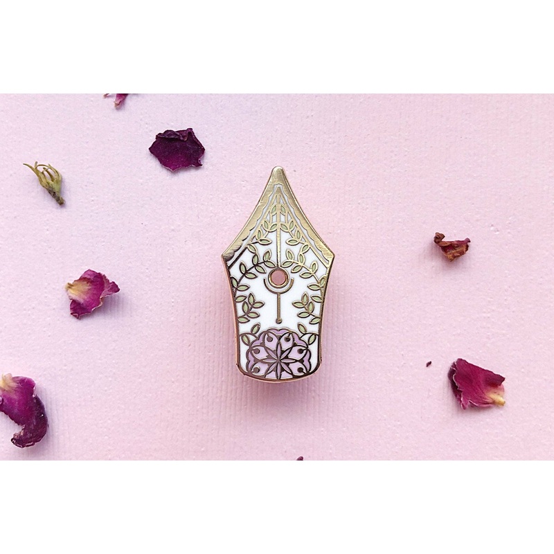 This gorgeous fountain pen enamel pin makes a nice gift for writers, editors, storytellers and fountain pen aficionados. Featuring a leaves and flower design with a circular cut out, this fountain pen pin is 1.25″ and uses a white, green and pink color palette. This hard enamel pin is set on a highly-polished gold-plated metal and has two posts on the back.THE FEATURES – Highly polished gold-plated metal. – 1.25 hard enamel pin. – Has two posts on the back to secure the pin and prevent rotation during wear. – Features white, green and pink colors. – The floral fountain pen illustration is based on my original artwork. – Stamped with “Alum & Ink” on the back. – Comes mounted on a backing card and packed in a protective bag for protection. – Photography props and backdrops not included.