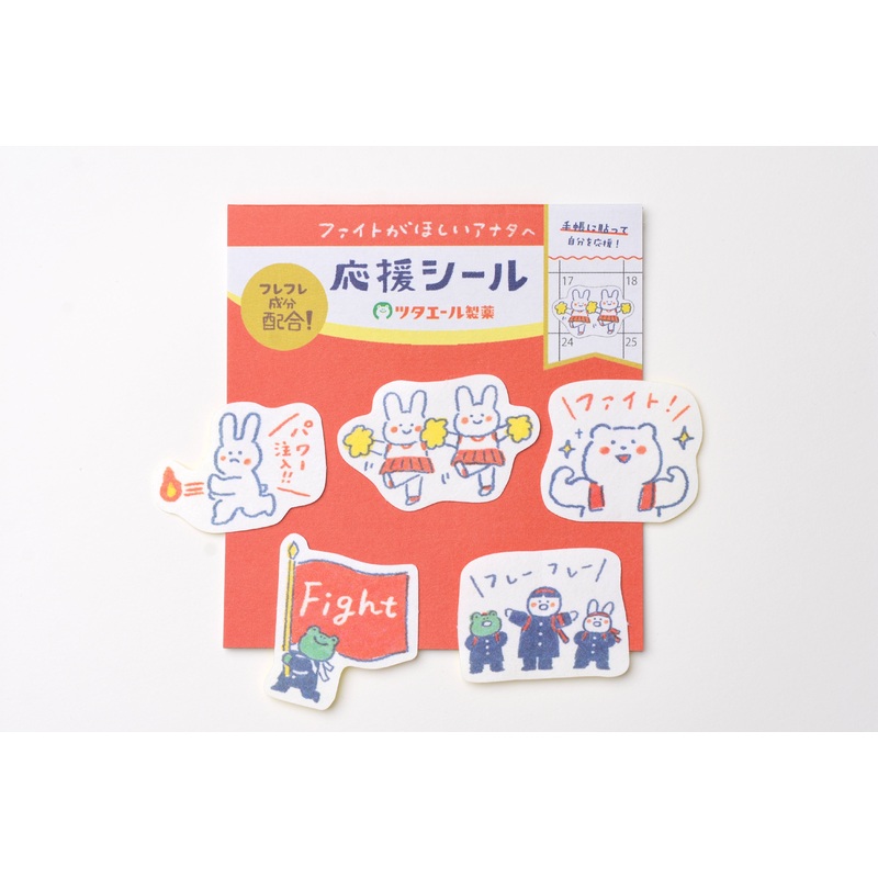 Stickers conveying different phrases of encouragement featuring human, frog, bear, and rabbit charactersin an illustrated style.Material: washi paper20 individual flake stickers included5 designs x 4 stickers eachMore Furukawa Flake Stickers