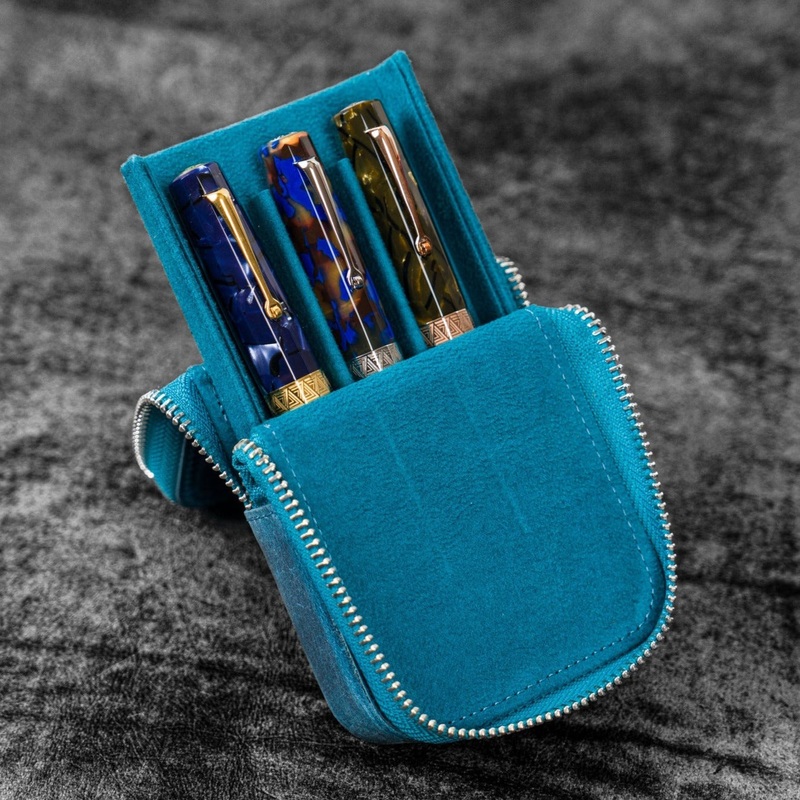 Transport your favorite pens safely without them getting damaged or scratched with ourHandmade Zippered Magnum Opus 3 Slots Pen Case in Ocean Blue. This sturdy case features a removable tray that slides in and out effortlessly, providing you easy access to your pens. The removable tray also includes 3 individual pen slots lined with soft velvet material to prevent scratches. Whether you’re carrying your pens in your in bag or luggage, you’ll have the peace of mind knowing that your pens are well protected from bumps, knocks, scratches and damage with this leather case. Suitable for most fountain pens and other type of pens.