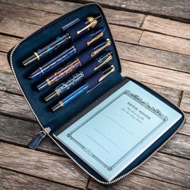 This Leather Zippered Pen Case in the new distressed Crazy Horse Navy Blue color has a velvet lined interior and holds up to 5 pens. When you want to carry your favorite pens, you will want to protect them in your bag, purse or pocket to prevent the ink leaking everywhere or the pens getting scratched. This leather pen holder is great to protect your fountain pens and keep them safe.