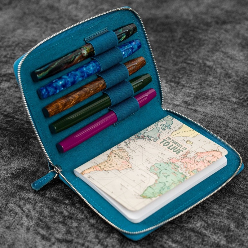 This Leather Zippered Pen Case in the new distressed Crazy Horse Forest Green color has a velvet lined interior and holds up to 5 pens. When you want to carry your favorite pens, you will want to protect them in your bag, purse or pocket to prevent the ink leaking everywhere or the pens getting scratched. This leather pen holder is great to protect your fountain pens and keep them safe.